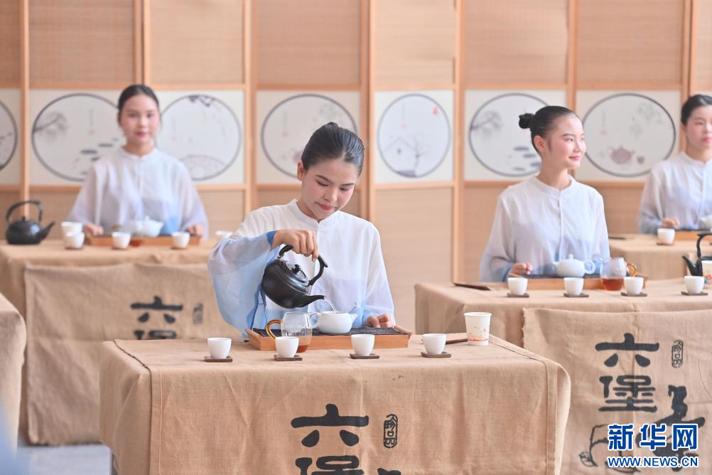 10月15日,在梧州市苍梧县六堡镇六堡茶文化广场,工作人员进行茶艺表演。