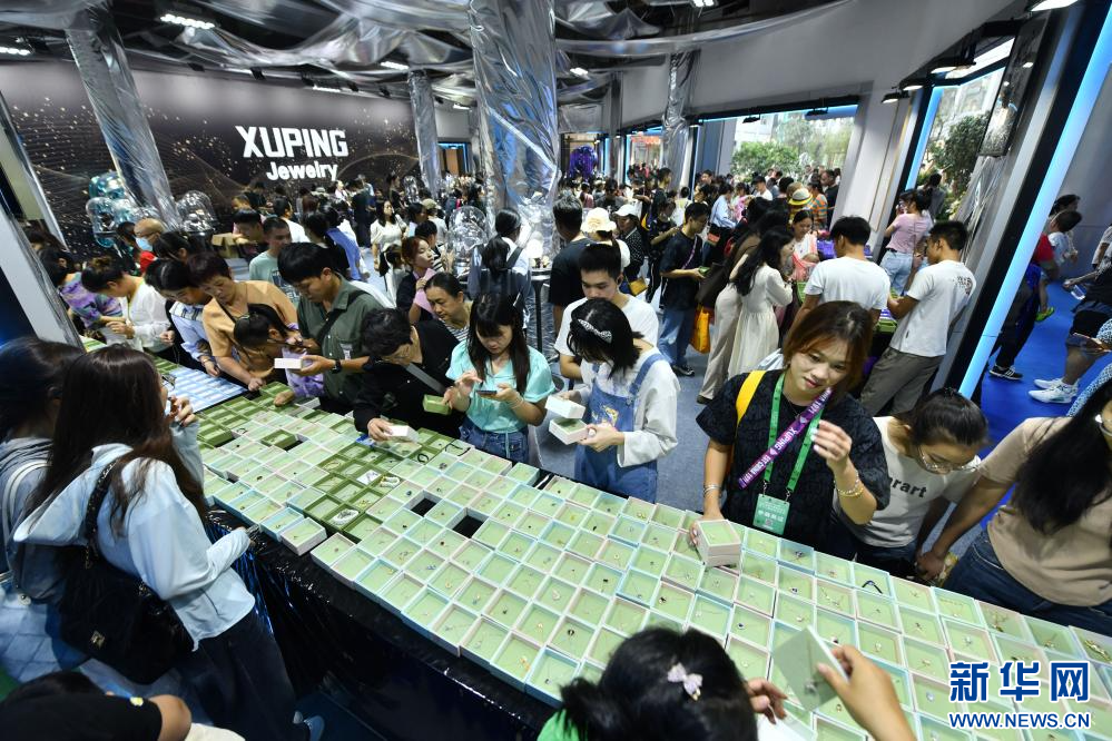 10月15日,在梧州市六堡茶城,观众选购饰品。