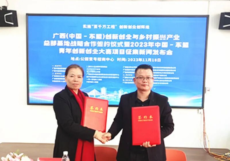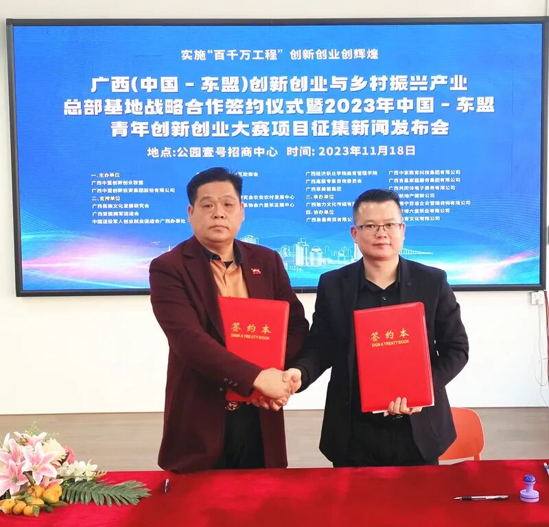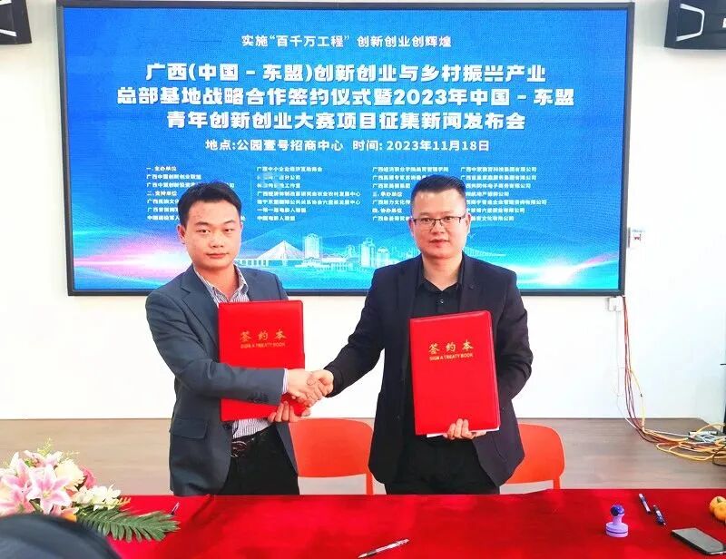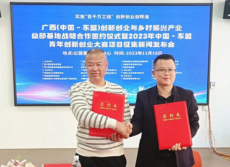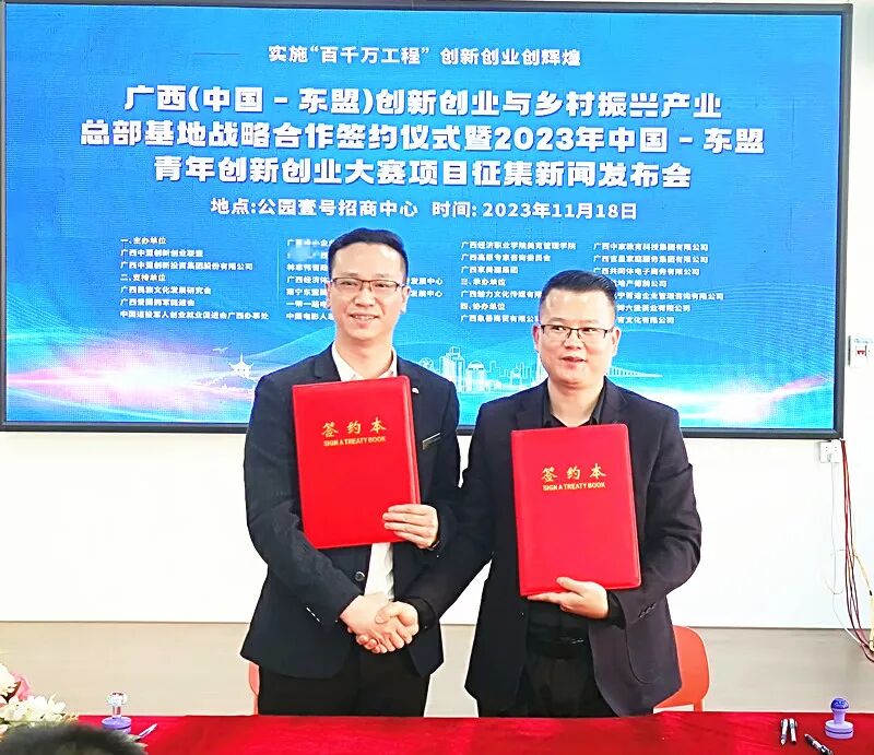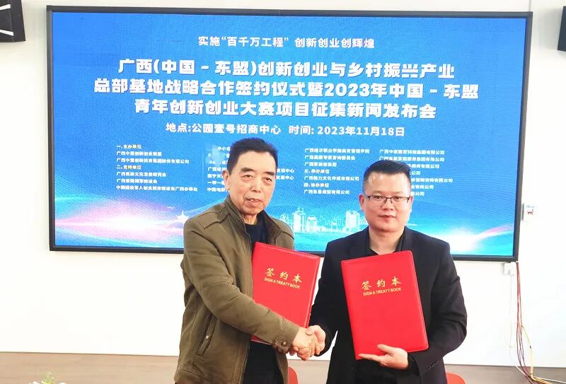 11月18日下午,“广西(中国·东盟)创新创业与乡村振兴产业总部基地战略合作签约仪式暨2023年中国-东盟青年创新创业大赛项目征集新闻发布会”在南宁举行,主办方代表分别与11家战略合作企业签订了协议书。有关部门领导、特邀嘉宾、签约企业代表、新闻媒体代表以及主办方负责人等60多人与会。