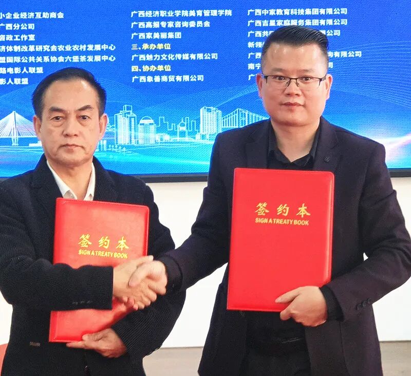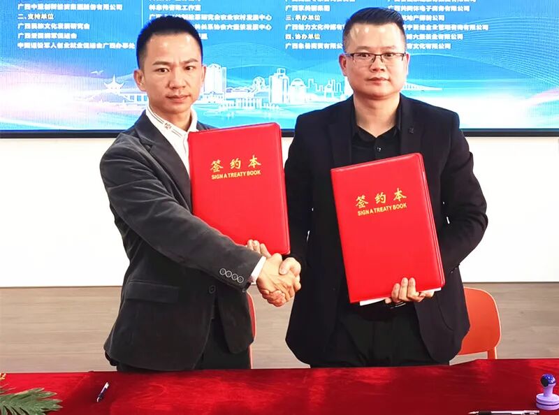 在签约环节,王祖能代表广西中盟创新创业联盟及总部基地,分别与广西共同体电子商务有限责任公司、广西龙头数据科技有限责任公司董事长崔智杰,桂螺皇食品科技有限公司总经理丁华艺,防城港市玛诗卡投资有限公司总经理莫志凤,柳州市赞巴农业科技有限公司总经理杨艺军,广西中起工程机械服务有限责任公司总经理钟勇,深圳艺鸰传媒有限责任公司总经理陈东,广西美育文化有限公司董事长邓素云,广西健康食品集团有限公司董事局主席张伯任,广西火汇农业科技有限公司董事长、南宁茶博六堡茶业有限公司法人黄海东,广西海丝路电影人集团董事局主席李文龙,广西南宁哲途企业管理咨询有限公司董事长郑素勇等11家企业代表签订了战略合作协议,立志抱团发展,互助共赢,共同推动总部基地的建设,合力帮扶青年大学生与退役军人成功创新创业就业。