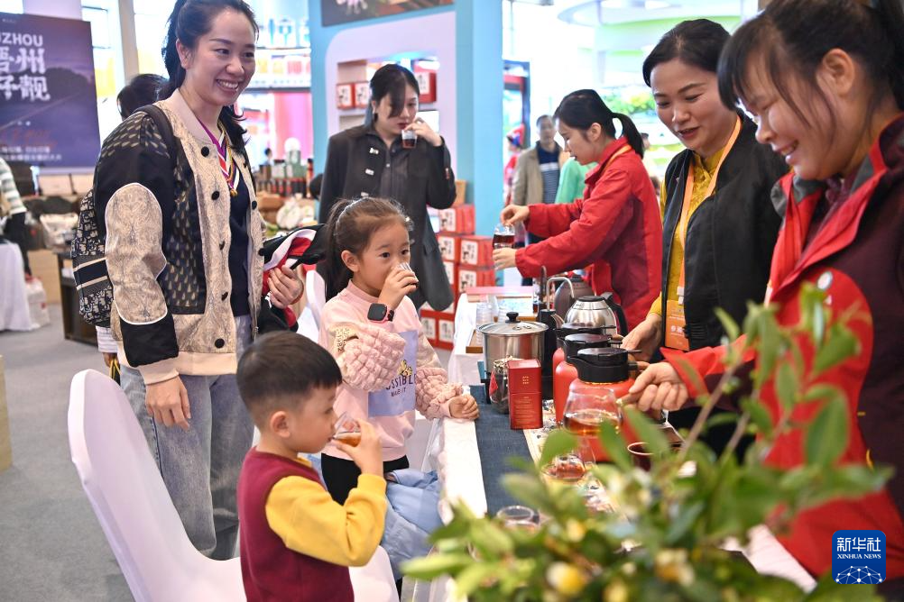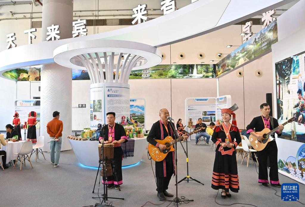 11月18日,演员在展位上用瑶语演唱迎客歌。