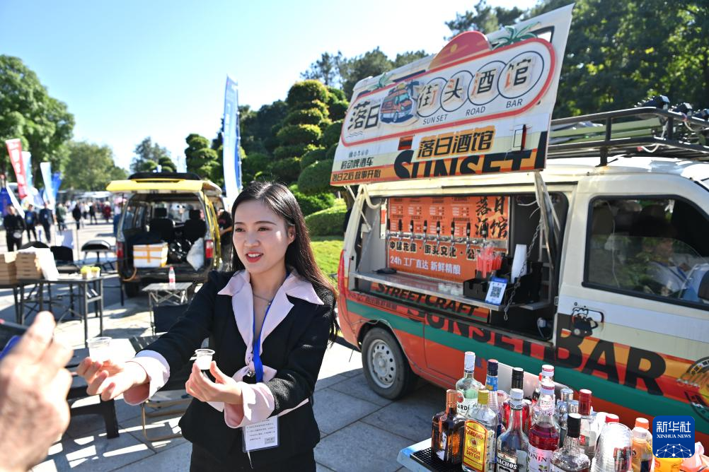 11月18日,一名汽车尾箱摊主在推销饮品。