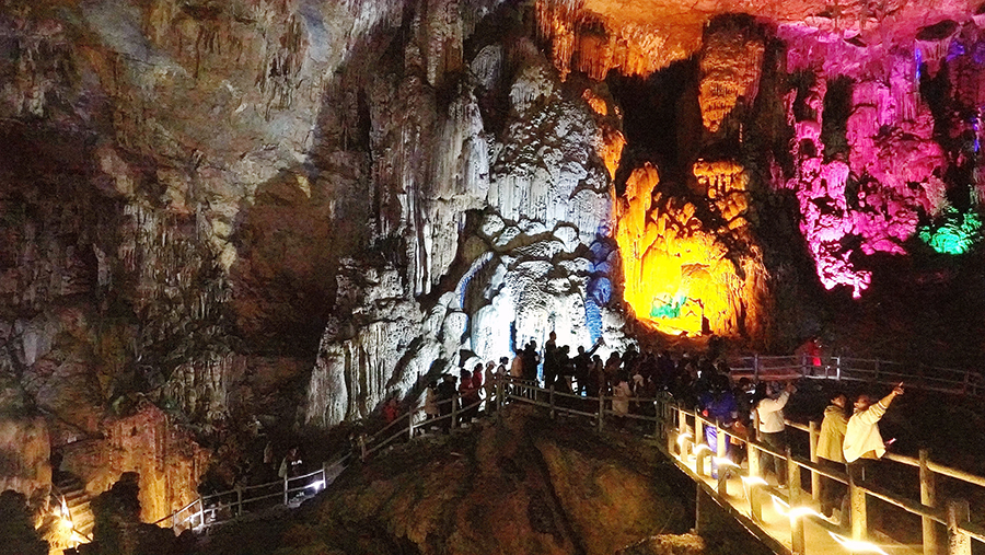 据了解,鸳鸯洞雄踞凤凰山腰,为云贵高原南缘岩溶中高位双层溶洞,洞长480米,最宽处320米,岩厅最高点52米,面积为2.92万平方米,洞内大厅规模宏大,素有“中华神奇雄伟第一洞”美誉。