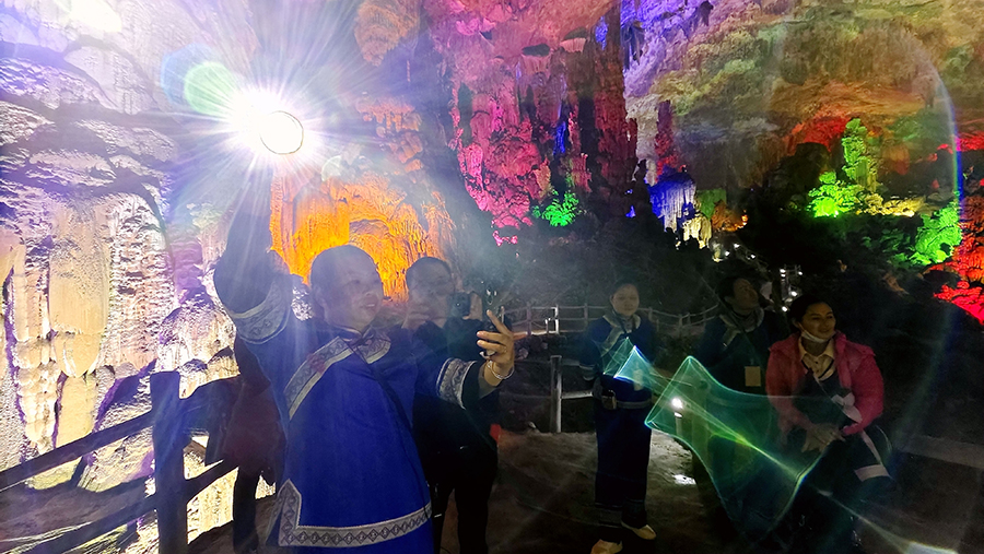 游人在广西凤山县鸳鸯洞景区参观游玩。高东风 摄 鸳鸯洞多彩景色如画卷。高东风 摄 游客在鸳鸯洞内拍照留念。高东风 摄