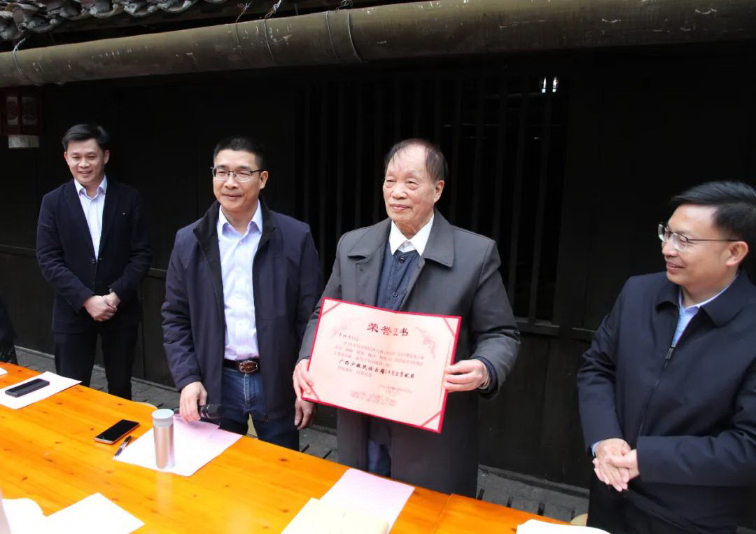 广西少数民族古籍保护研究中心主任韦如柱(左二)为韦体吉(右二)颁发证书。