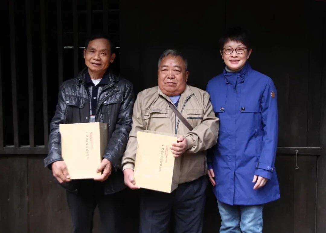 广西教育出版社副总编辑吴春霞(右)向都安密洛陀文化研究会代表赠送图书。