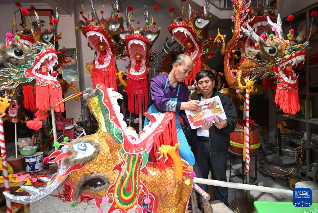 1月16日,在广西宾阳县宾州镇三联街,邹玉特(左)在挑选扎制炮龙的材料。