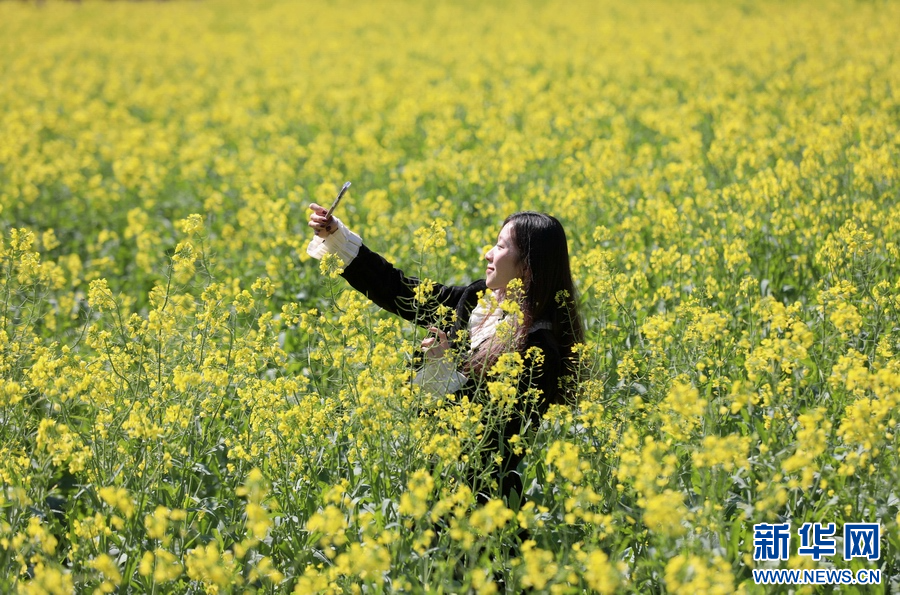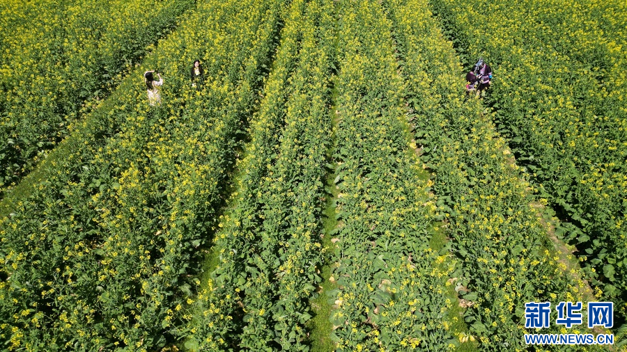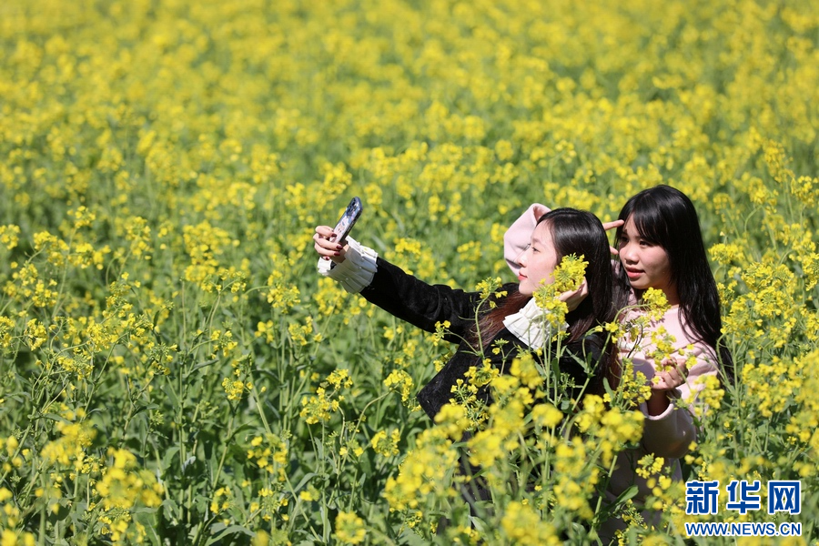 近日,广西柳州市三江侗族自治县老堡乡塘库村的百亩油菜花迎春绽放,宛若金色地毯铺满山间,田间处处流金溢彩、清香沁人,吸引众多游客前往踏春赏花。