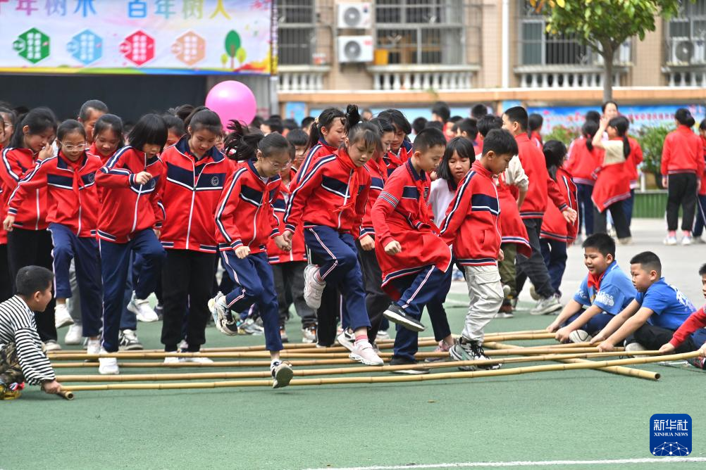 3月26日,在梧州市长洲区新兴二路小学,同学们在课间练习竹竿舞。