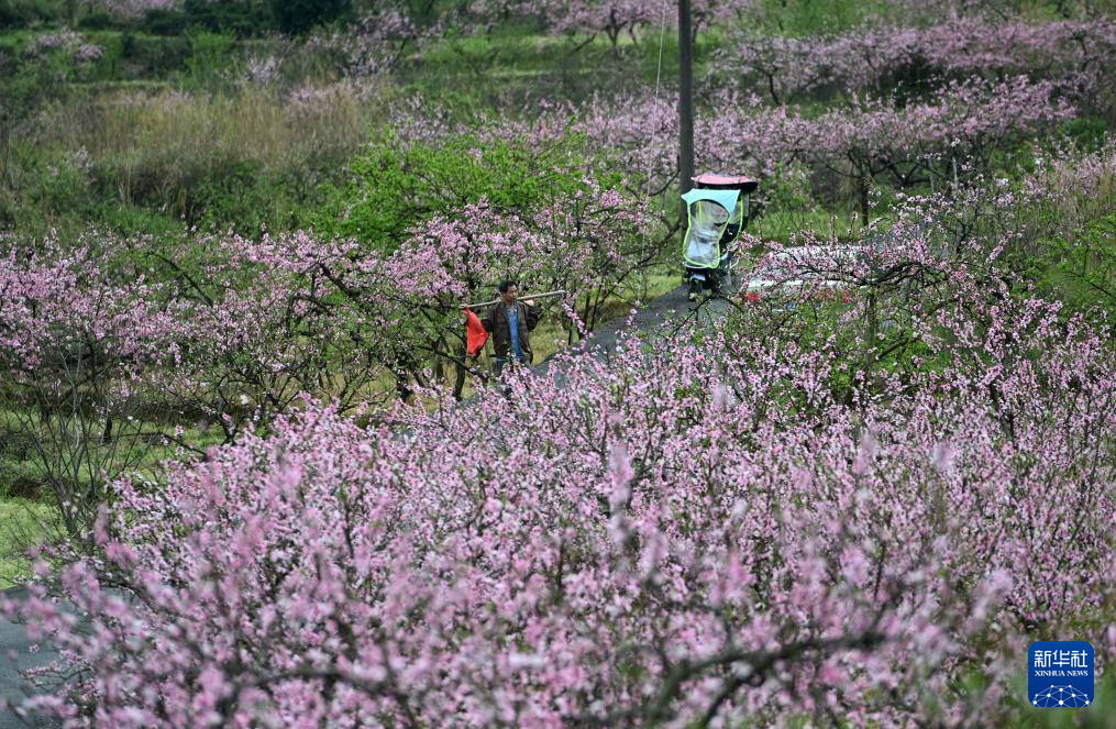 3月26日,村民在灌阳县水车镇官庄村水车桃园劳作。