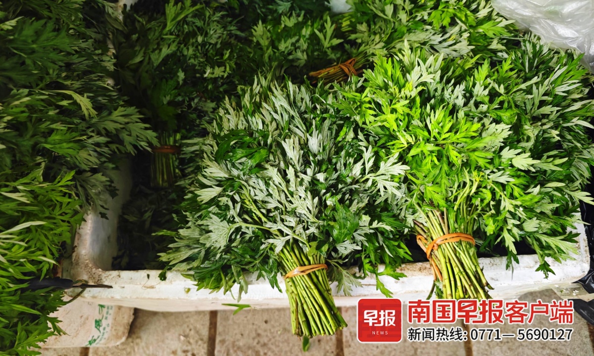 ▲市场摊位上的新鲜艾叶。记者 何定坚 摄