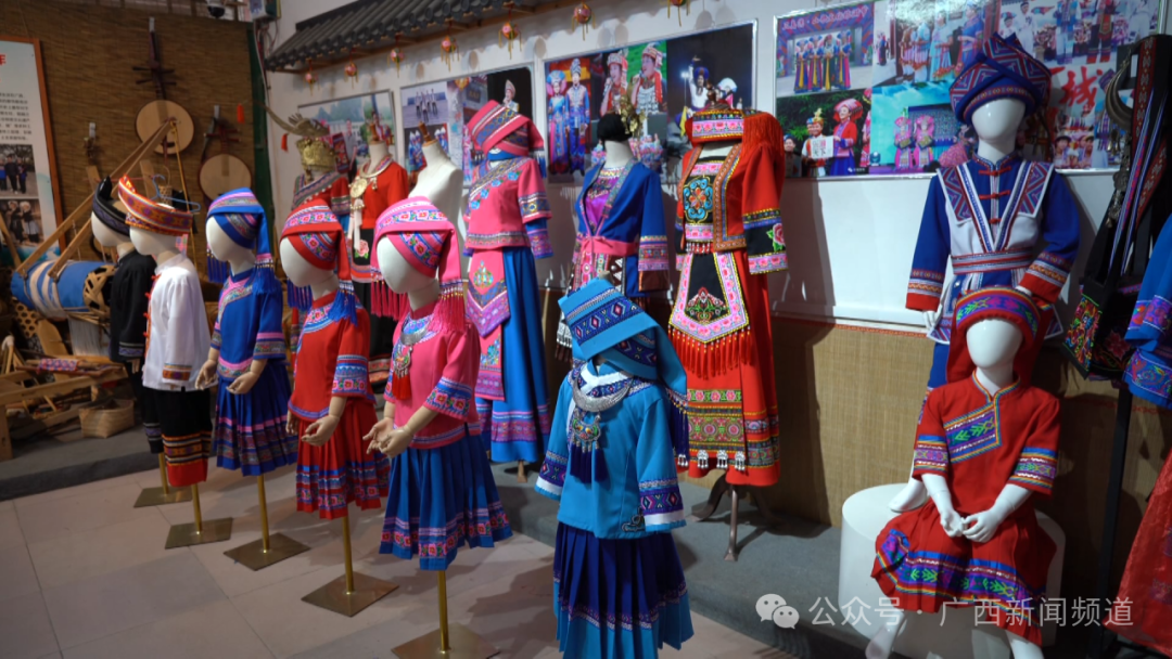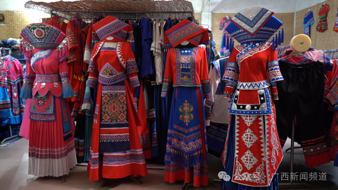 在来宾市忻城县,手工壮族服装最近也迎来了畅销期。制作精美的成品摆放整齐,每一套都独具特色。此外,绣球、壮锦娃娃、耳饰等民族元素饰品也琳琅满目,充满浓浓的民族文化气息。