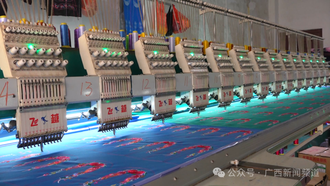 刺绣机高速运转,五彩丝线在布匹上丝丝缕缕地蔓延开,一个个具有民族特色的纹饰迅速成形,它们将出现在民族服饰的衣背、袖口、腰带等部位。