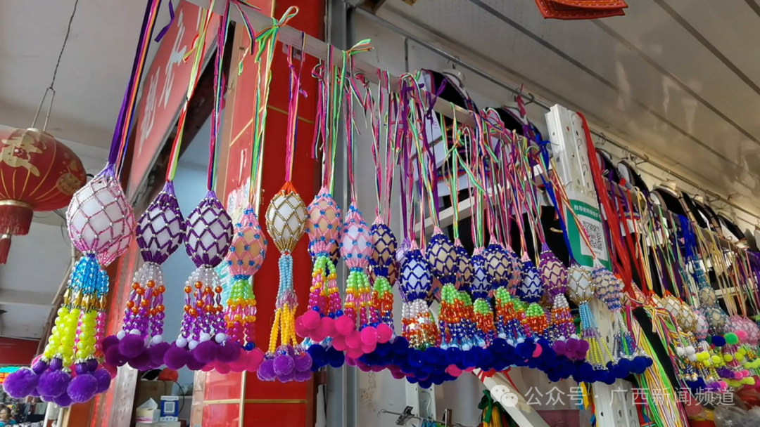 除了民族服饰,各类特色挂件也迎来热销。在百色市西林县,“三月三”赶歌圩时,男女青年会借用彩蛋进行交际,通过“碰彩蛋”传达好感和心意,如今则演变为给小朋友“挂彩蛋”,寄寓美好平安。因此,大街小巷的彩蛋笼被人们争相选购。
