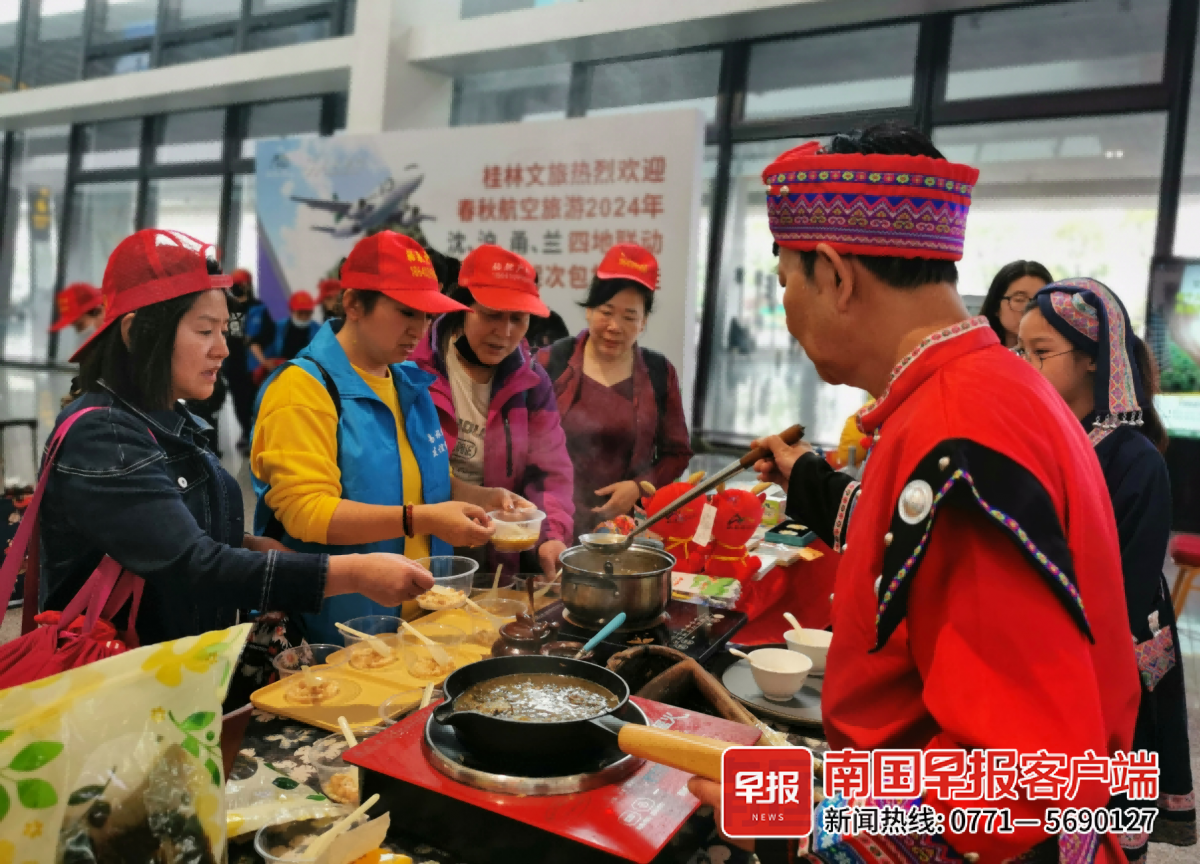 ▲抵达桂林的游客品尝恭城油茶。记者 唐晓燕 摄