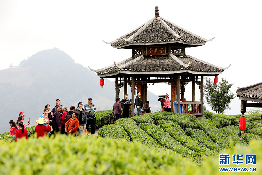 游客在广西三江侗族自治县八江镇布央村仙人山茶园参观。