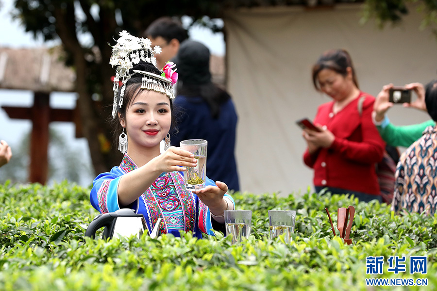 一名侗族姑娘在广西三江侗族自治县八江镇布央村仙人山茶园向游客展示茶艺。