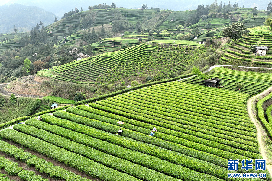 茶农在广西三江侗族自治县八江镇布央村仙人山茶园采摘明前茶。