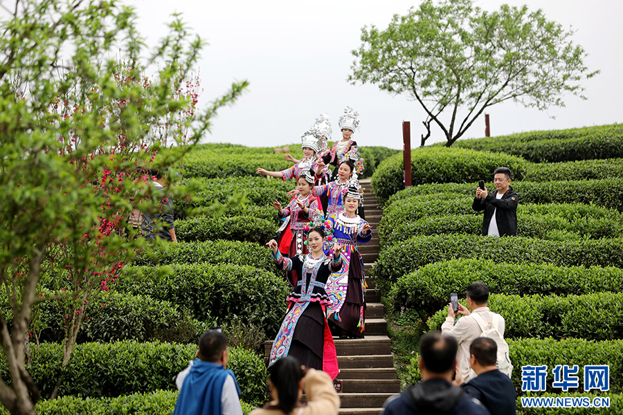 侗族姑娘在广西三江侗族自治县八江镇布央村仙人山茶园向游客展示侗族服饰。
