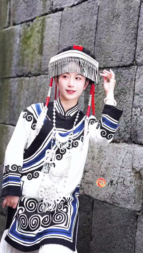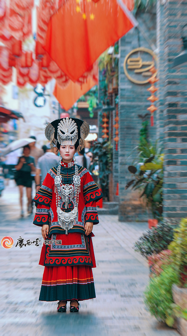 2024年4月2日,一名女子身着彝族盛装在南宁三街两巷景区打卡拍照。蓝华 摄