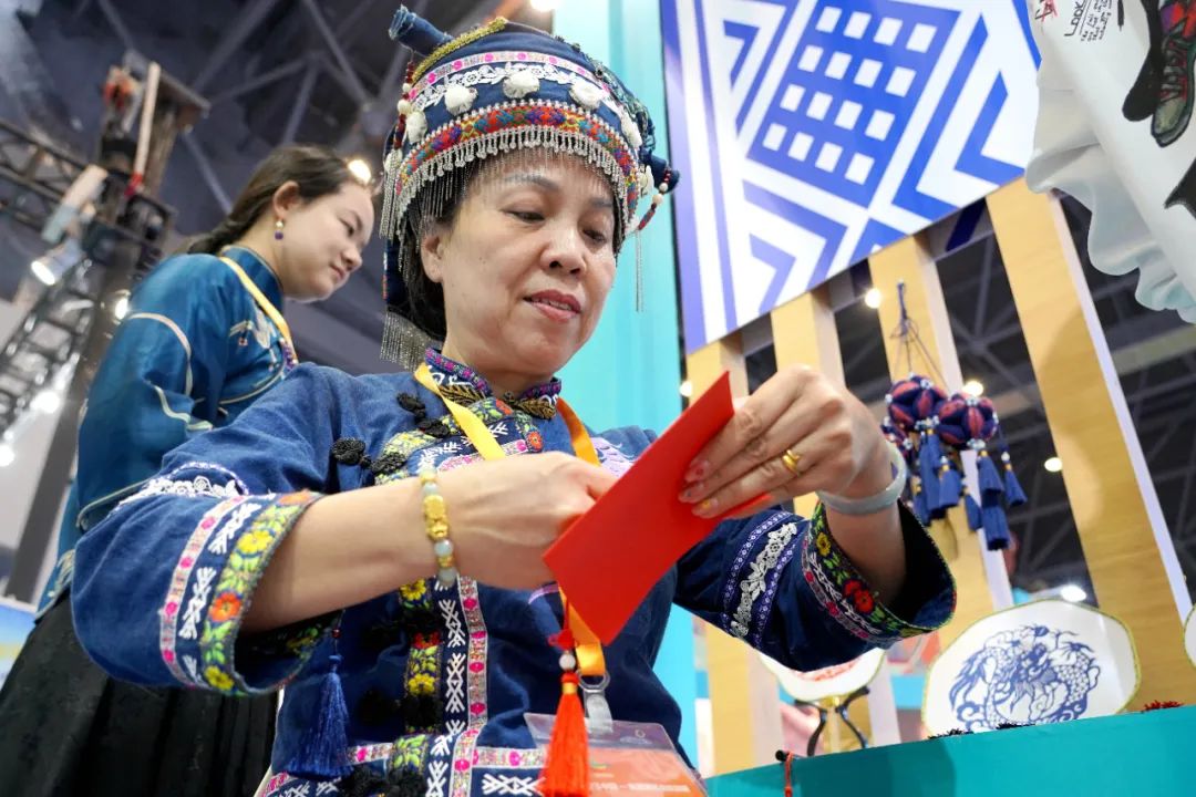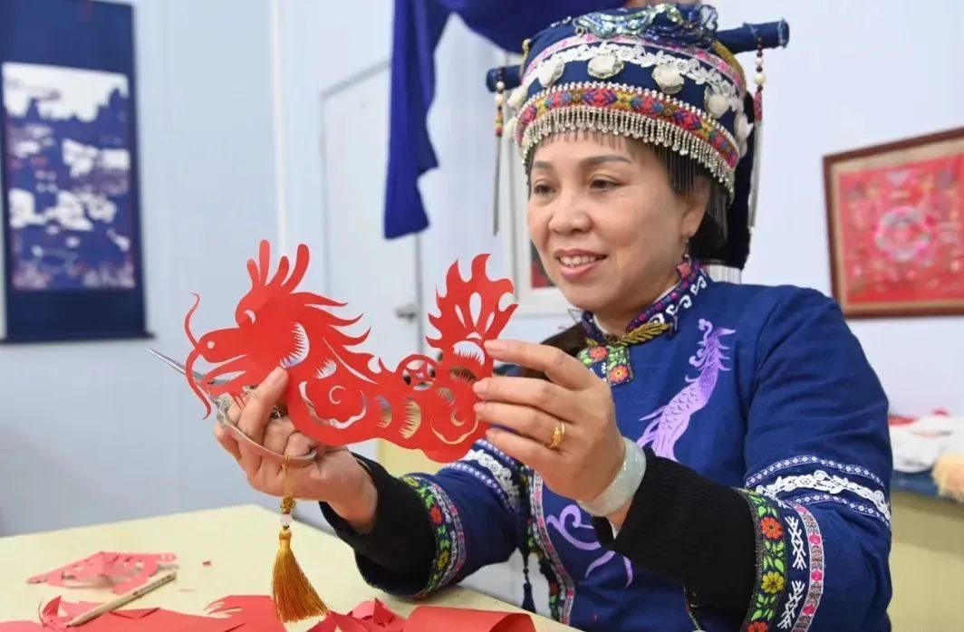 2023年10月13日至15日,罗城组织参加2023中国-东盟博览会旅游展,仫佬族剪纸技艺非物质文化遗产传承人罗华清在剪纸。