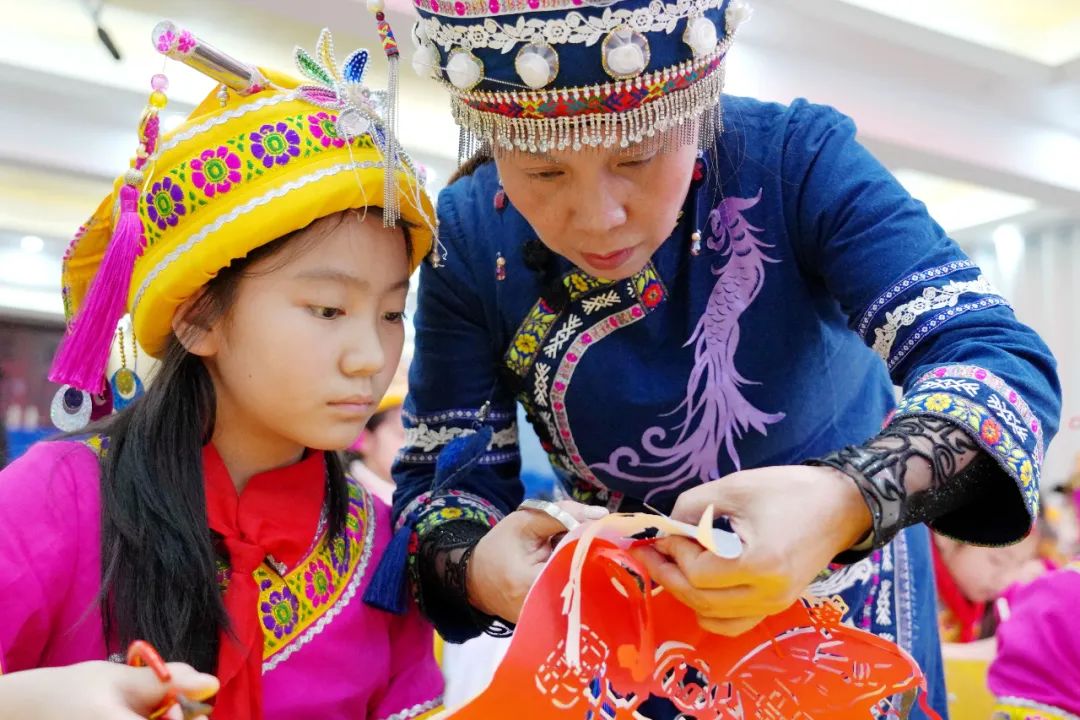 2023年3月28日,罗城仫佬族自治县第二小学开展“国家安全·非遗文化”进校园剪纸主题活动,罗华清正在现场教学生如何剪纸。
