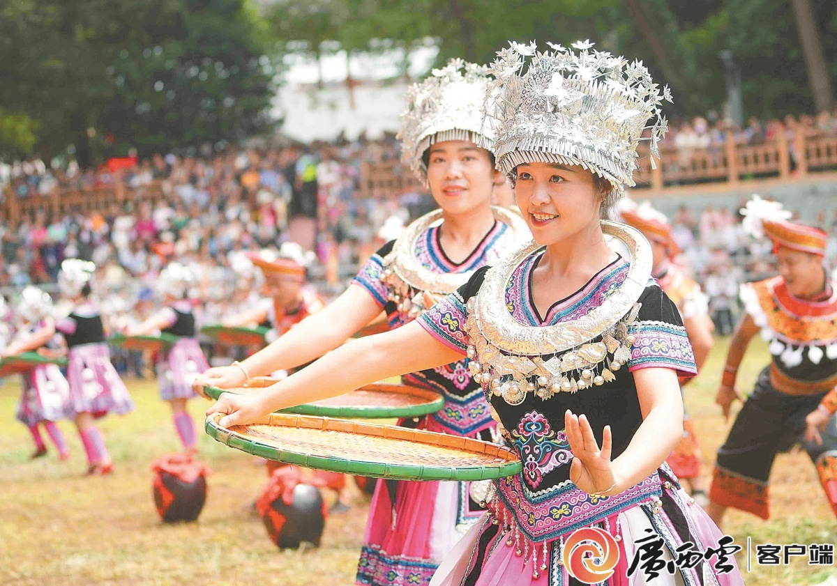 5月1日,融水苗族自治县斗马超级联赛开幕,丰富多彩的传统文化活动吸引众多游客前来体验。图为苗家女在表演节目《幸福苗山》。龙 涛 摄