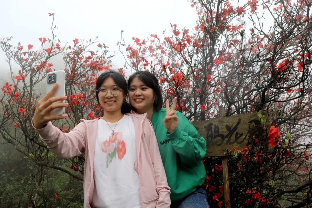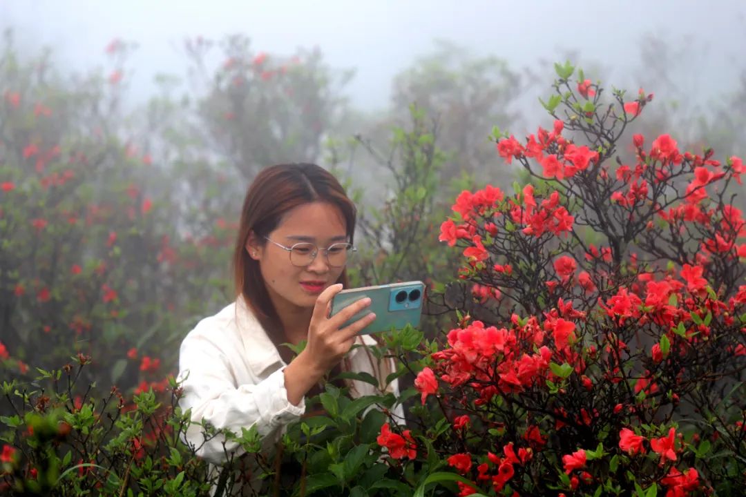 海南游客周梅柳说:“听说元宝山的野生杜鹃花很漂亮,我们慕名而来,虽然今天遇到雾天天气,但是雾中看花给我一种非凡的体验,雨儿落在花上,显得花儿更加娇艳美丽。”