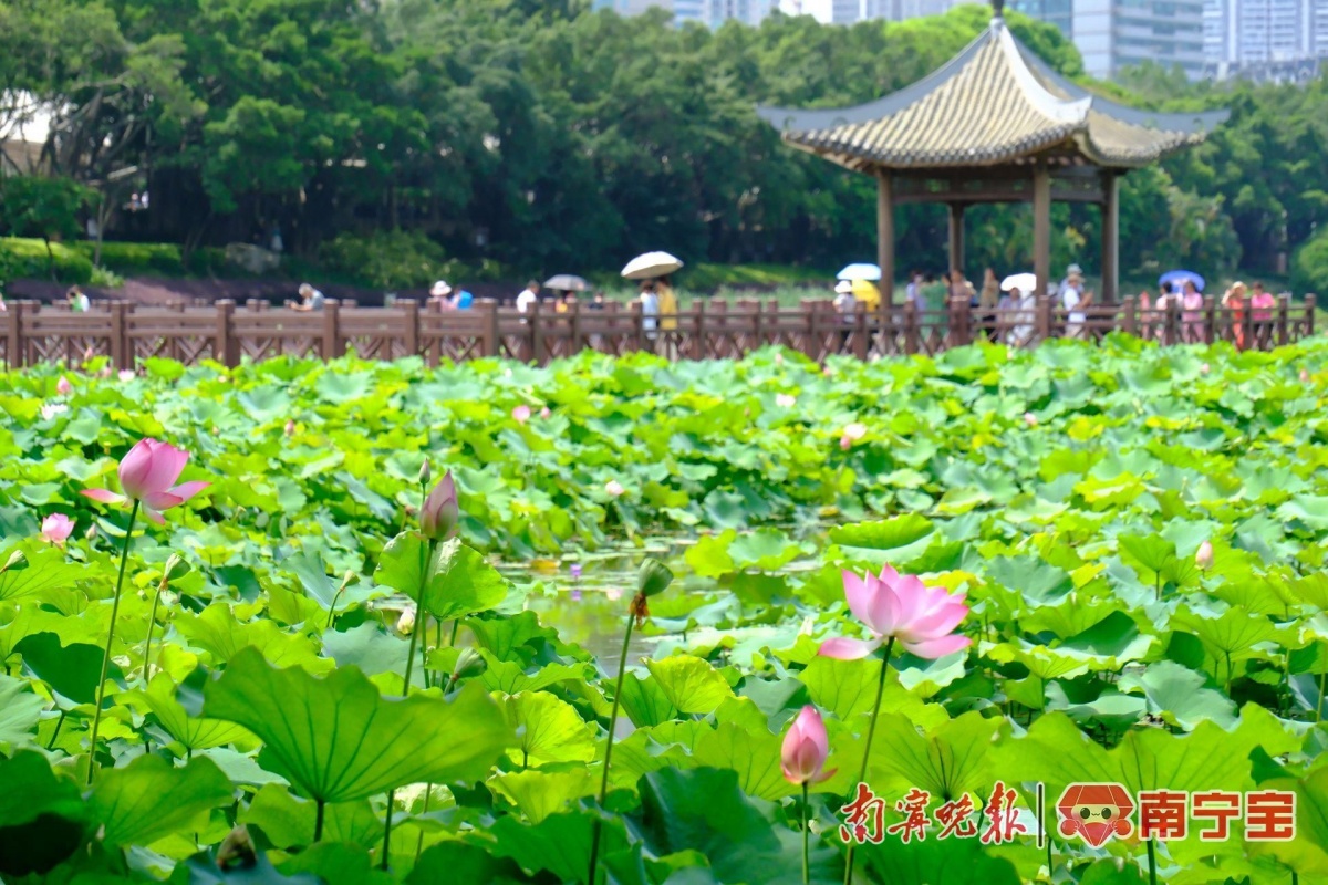 荷叶摇曳,荷花飘香,即将到赏荷最佳时节。南宁市南湖公园九曲桥荷花池近2000株荷花虽然“小荷才露尖尖角”,但依然吸引众多市民游客前往游玩打卡。
