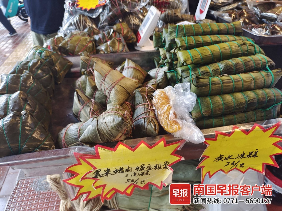 记者发现,无论是商超、酒店还是农贸市场,粽子的价格基本与去年持平。长条灰水凉粽2元/条、豆沙三角粽小的2.5元/个,500克的绿豆肉粽在5元~7.5元。南宁一酒店的销售人员表示,今年粽子礼盒的价格与去年持平,销量比去年略涨。