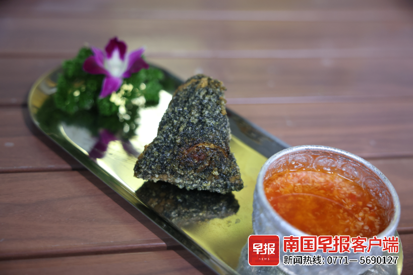 除了传统口味外,还有黑芝麻粽、“七龙珠”蛋黄肉粽等新品。勇于尝试的小伙伴不妨将黑米绿豆粽炸熟后,搭配泰式甜辣酱,解锁泰汁炸粽新吃法。