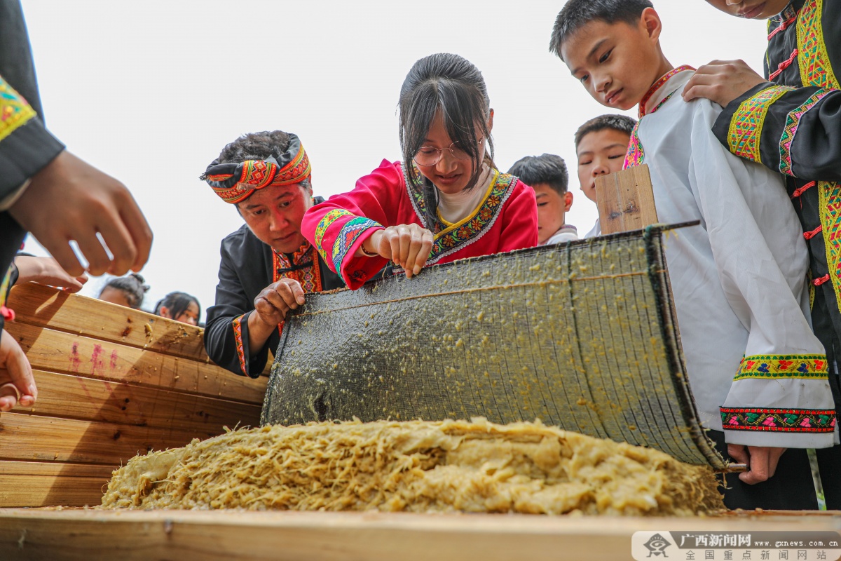 当天,在兰田瑶族乡民族学校的操场上,灵川兰田瑶族造纸技艺传承人赵流海正在为学生们讲解当地土法造纸工艺中抄纸工序的技巧和要求,只见他双手持竹框,迅速地在纸浆水中以竹帘荡料,沥水后将湿纸反面覆盖在木板上,不一会儿,湿纸就叠积到厚厚一层。围观的学生们跃跃欲试,在老师的指导下,纷纷参与其中,体验制作抄纸和在竹纸上书写带来的乐趣。