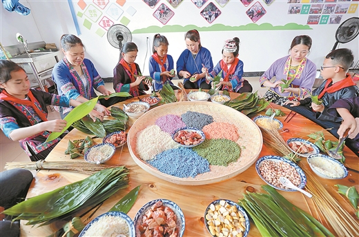 端午节期间,三江侗族自治县古宜镇江川小学开展多彩民俗进校园活动,师生及家长以包粽子、绣香囊等丰富形式,体验传统文化魅力。龚普康 梁秀明/摄