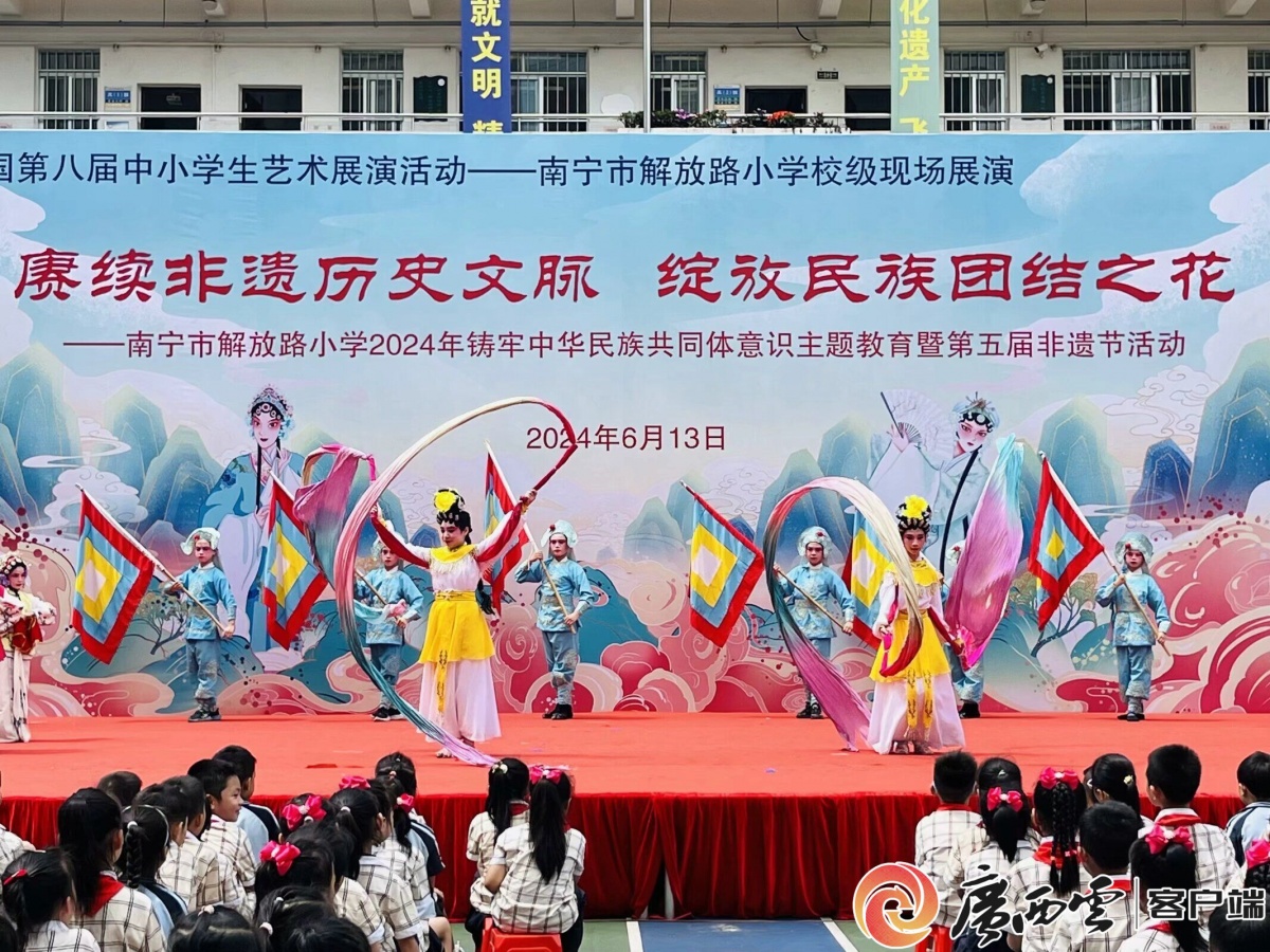 近日,南宁市解放路小学举行主题为“赓续非遗历史文脉 绽放民族团结之花”——2024年铸牢中华民族共同体意识主题教育暨第五届非遗节活动。