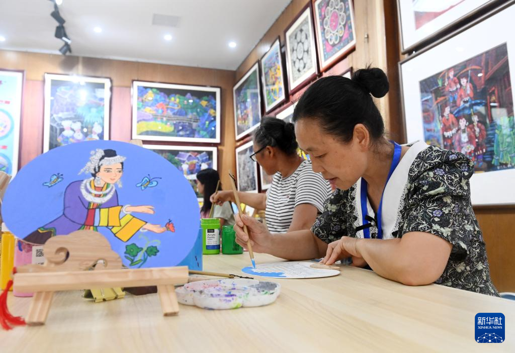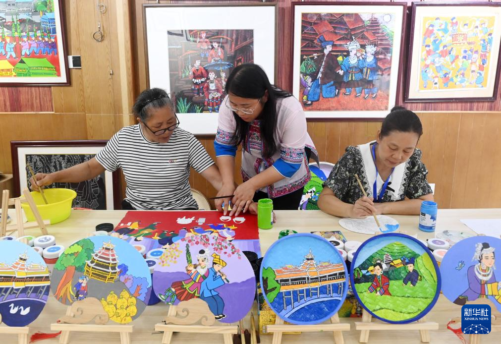 6月19日,在广西三江侗族自治县侗画馆,侗族农民画作者在创作。