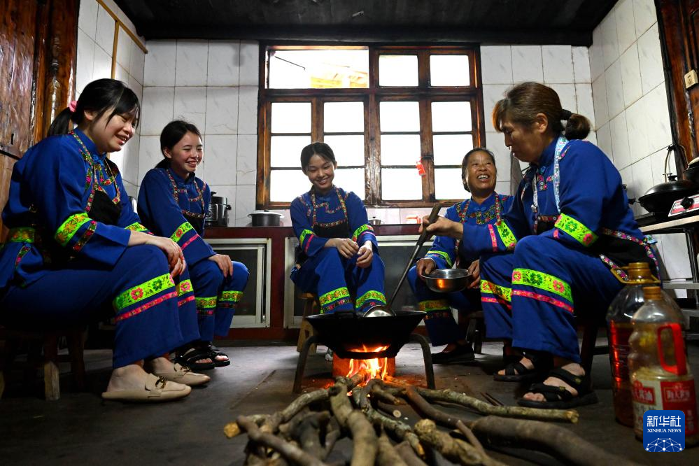 在广西龙胜各族自治县伟江乡布弄村,人们围在一起打油茶(6月26日摄)。