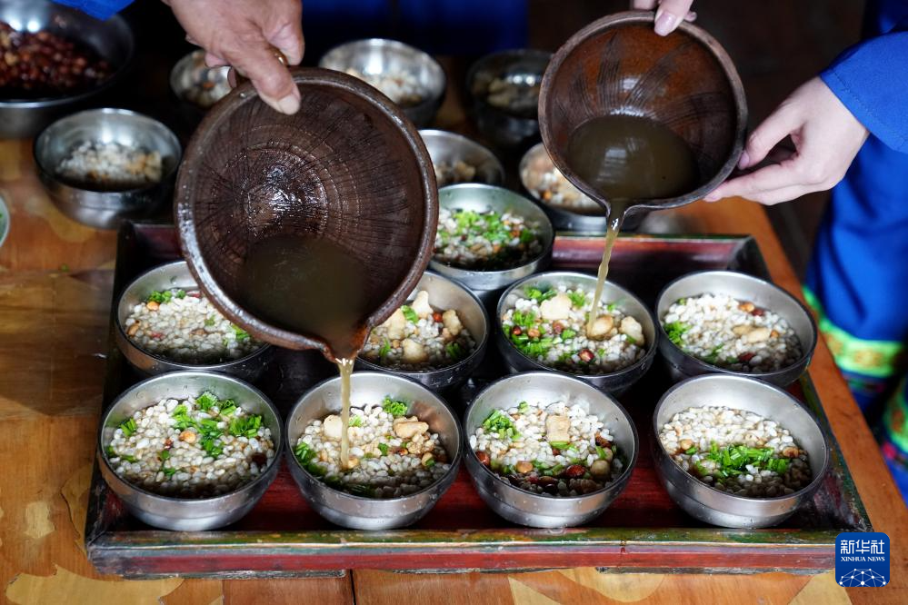这是广西龙胜各族自治县伟江乡布弄村苗家油茶制作部分流程,俗称“打油茶”。它不仅是当地村民一日三餐不可或缺的饮品,还是一年四季招待客人的必选。