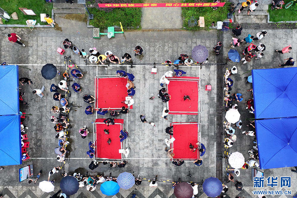 无人机航拍“祝著节”上的抛绣球竞技活动。新华网 刘君 摄