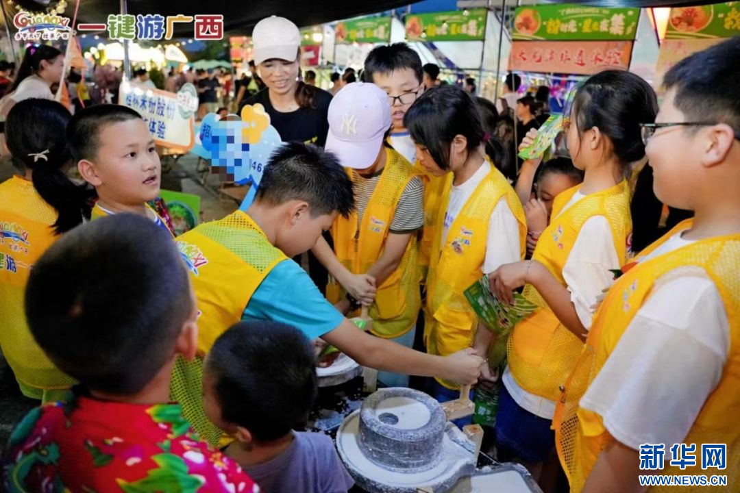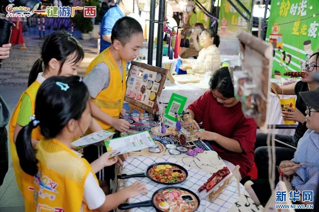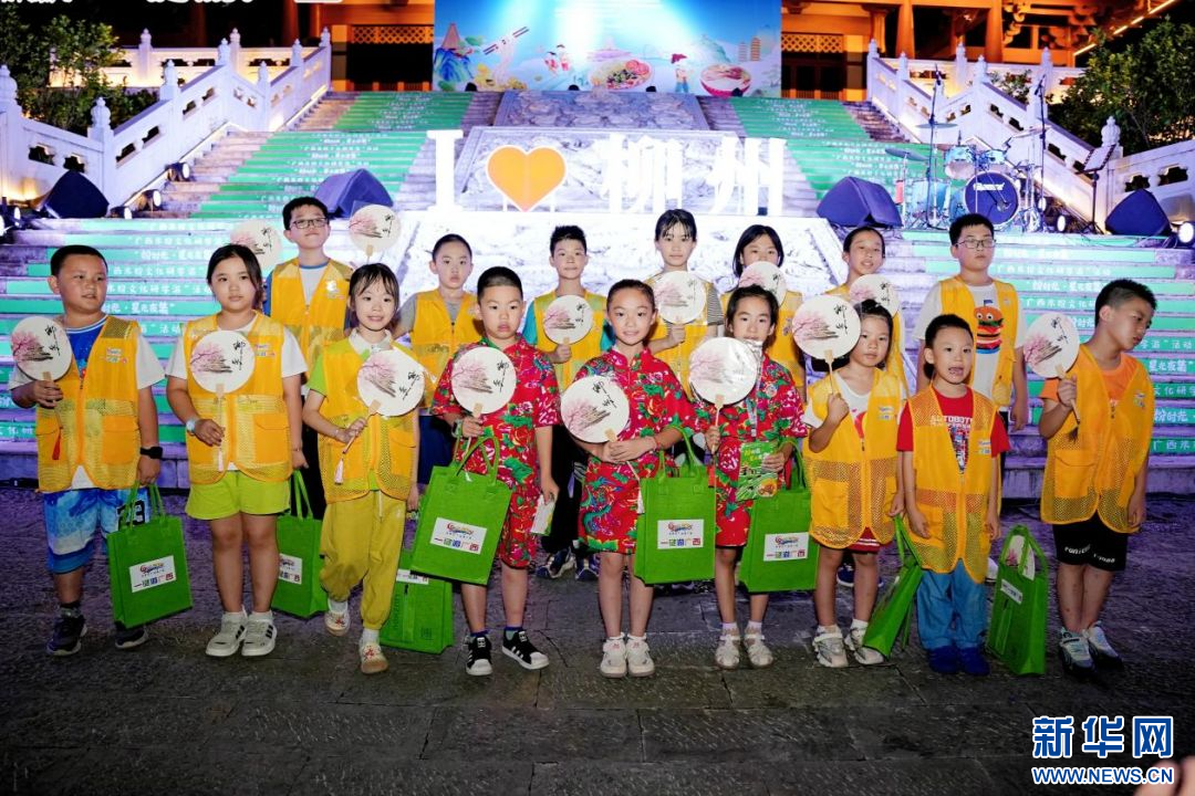 当晚,来自辽宁、北京、河北、广东等地的青少年组成的“广西米粉文化研学旅游体验团”,走进柳州窑埠古镇星光夜集开展研学。体验团的青少年成员们参与“就是这么柳”寻宝探秘游戏,学习柳州方言,体验传统米粉制作,寻找最具民族风的摊位,他们还收到当地小朋友送出的柳州特色“游学手信”。