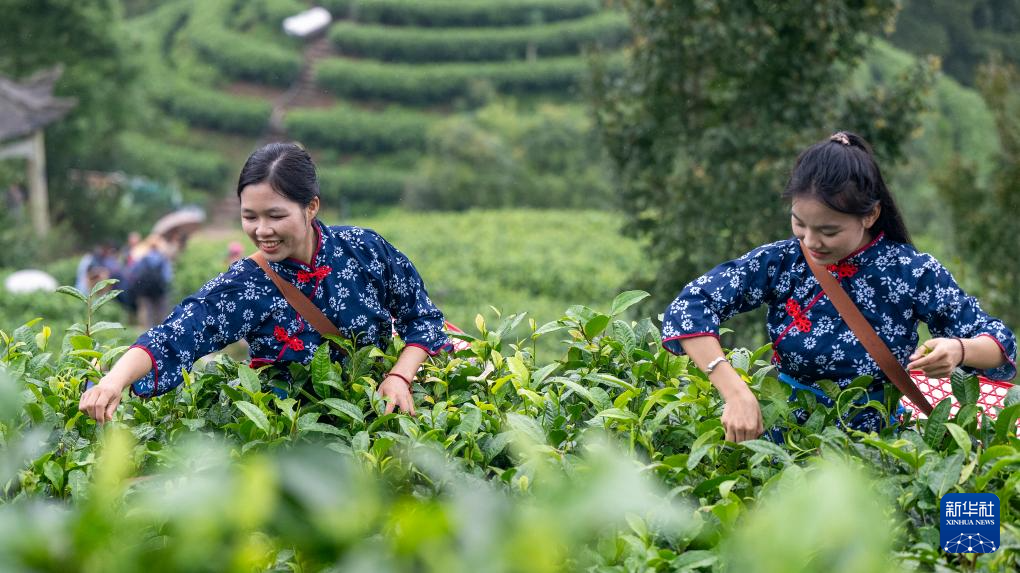 2024年7月28日,广西梧州岑溪市南渡镇井河村百福山有机生态茶园,茶农忙着采收夏茶,供应市场。近年来,南渡镇依托独特的地理位置和气候条件,以“党支部+合作社+茶农”模式大力发展茶产业,打造成了一井一河一茶园特色茶旅文创、休闲农业示范体验基地,通过茶旅融合、茶产融合延伸产业链,有效带动广大村民在家门口就业增收,助力乡村振兴。