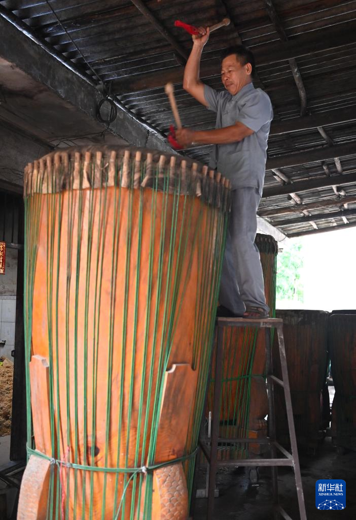 施绍汉指导孙子给烟墩大鼓绑钢丝绳,完成烟墩大鼓制作(8月15日摄)。