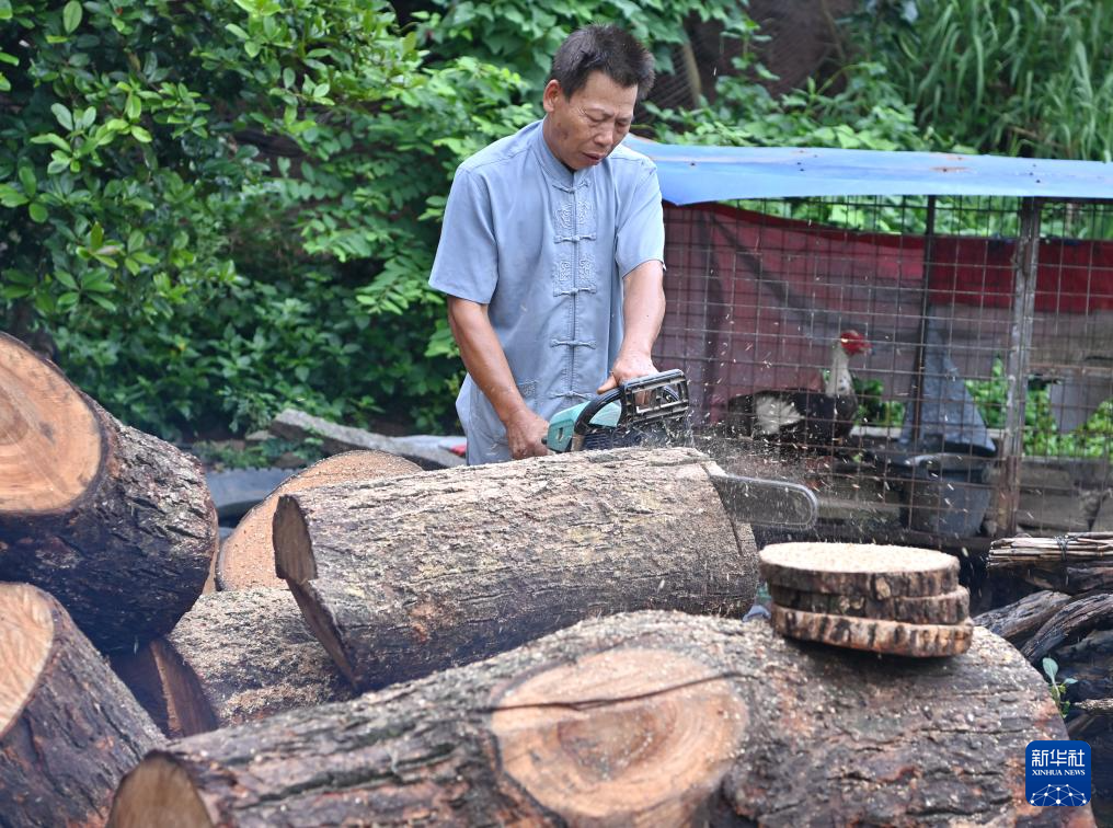 施绍汉在锯木头,准备制作烟墩大鼓(8月15日摄)。
