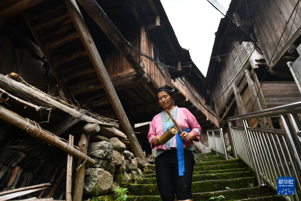 在融水苗族自治县杆洞乡尧告村,村民蒙金迷在打更巡寨(8月13日摄)。
