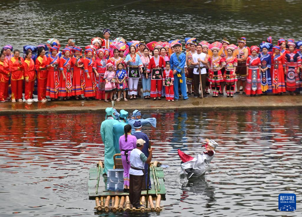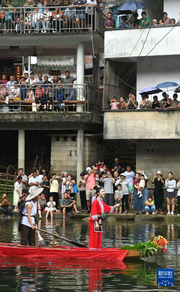 8月18日,在柳州市融水苗族自治县汪洞乡,村民们在改造后的河道上进行“刘三姐河上实景演出”。