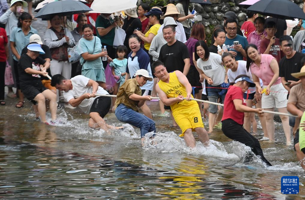 8月18日,在柳州市融水苗族自治县汪洞乡,村民们在改造后的河道上进行水上拔河比赛。