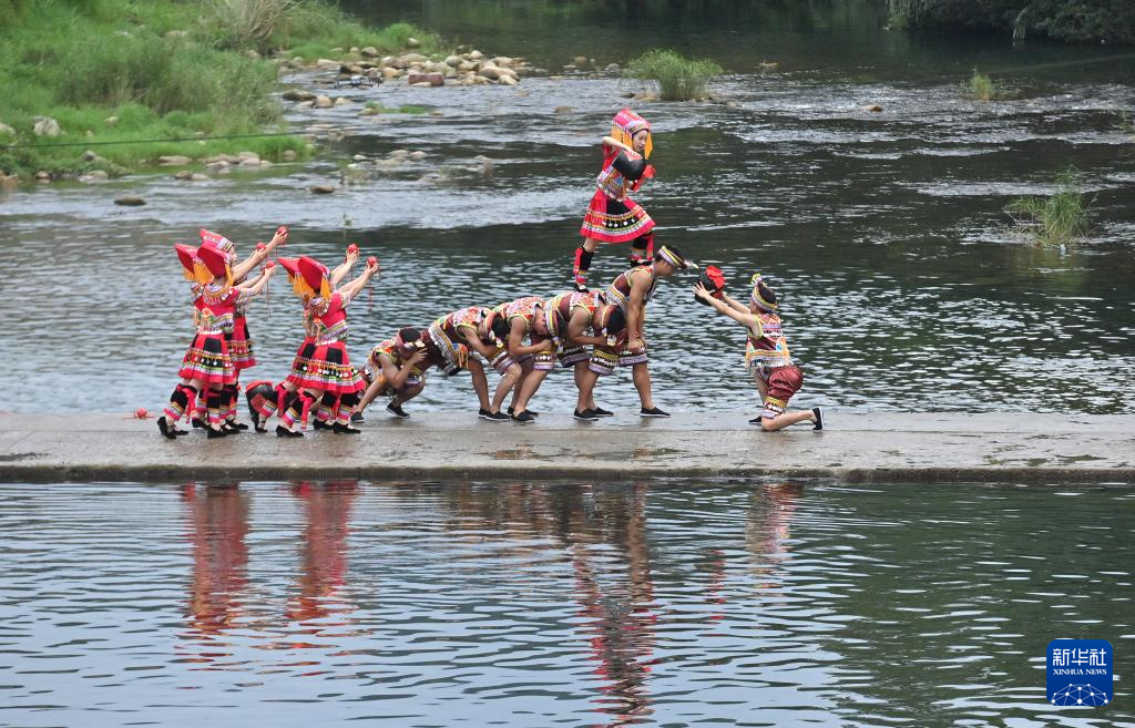 8月18日,在柳州市融水苗族自治县汪洞乡,村民们在改造后的河道上进行文艺表演。