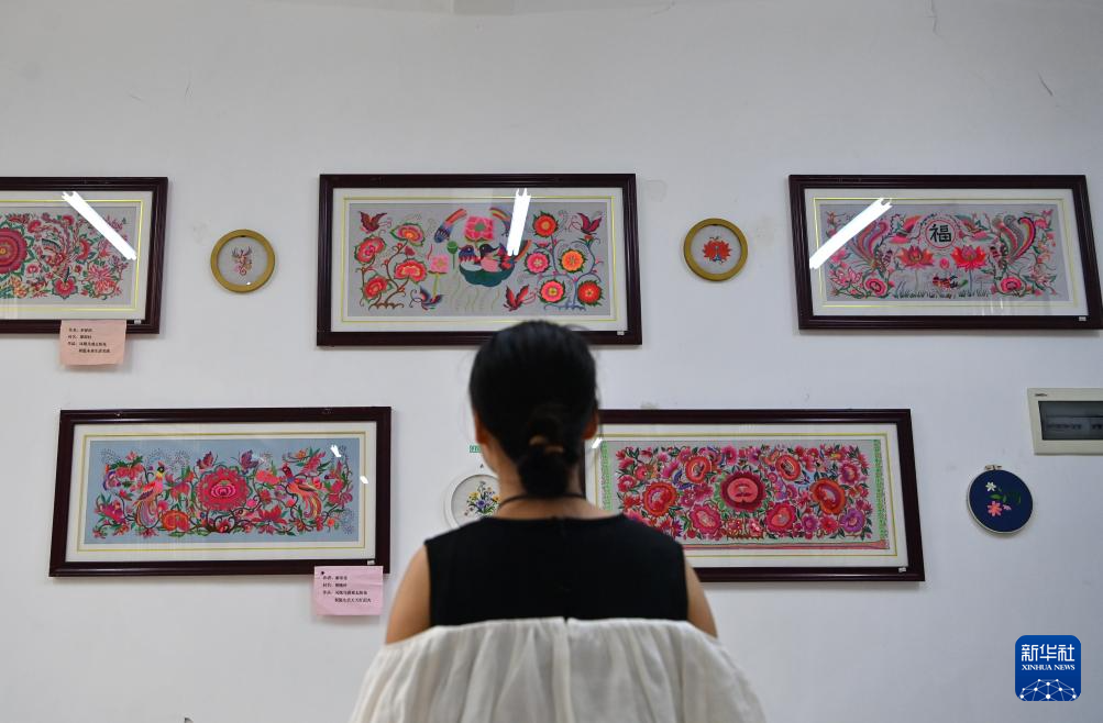 凌漫丽在田东县义圩镇七里刺绣基地展示她和村民制作的工艺品(8月20日摄)。