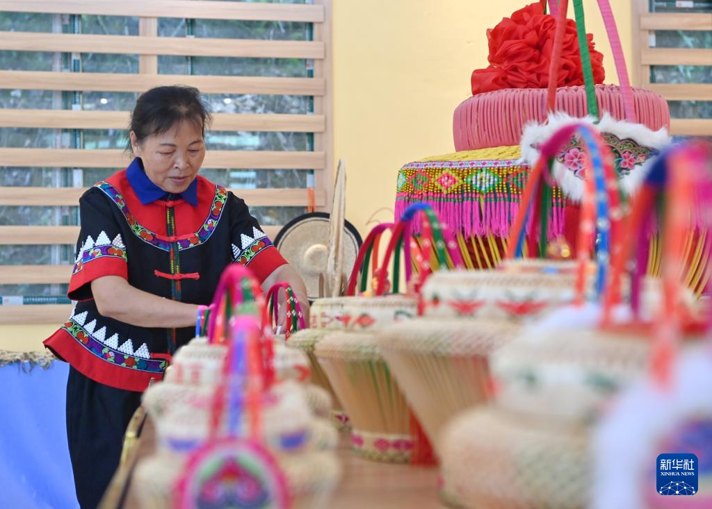 梁秀群在百色市田阳区巴别乡三坡村民俗文化传承馆整理麦秆花篮(8月21日摄)。