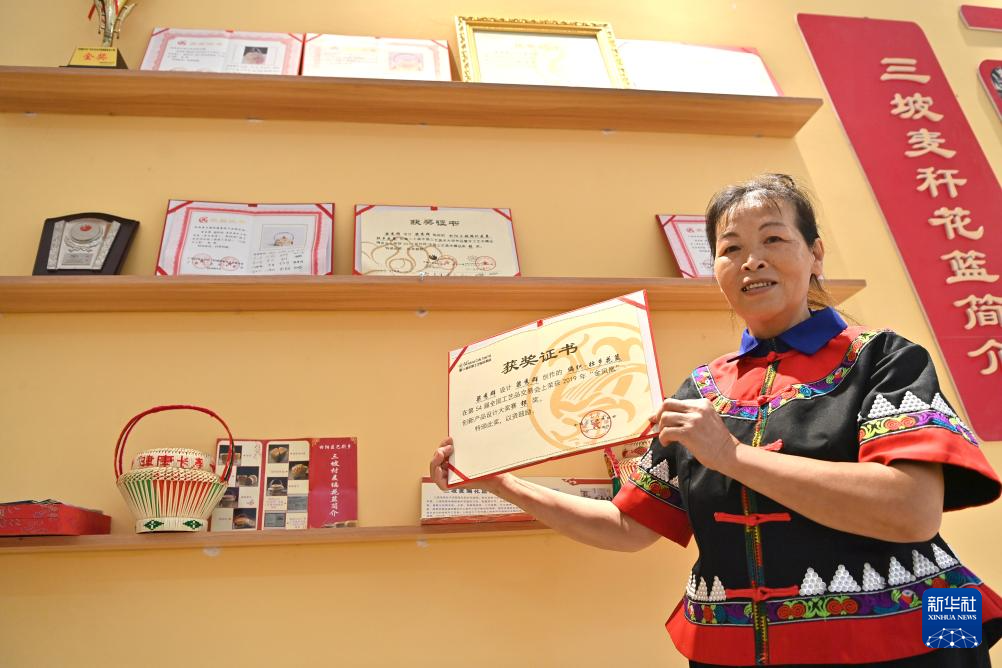 后来,随着麦秆花篮的外贸销路受阻,梁秀群也从县外贸局返回村里,但她对于麦秆花篮编织一直痴心不改。她不断提升花篮编织技艺,对花篮的外观和样式进行创新,还把这项技艺教给乡邻,组建了巴别三坡麦秆花篮编织小队。在她的带动下,仅三坡村就有30多人从事麦秆花篮编织工作。