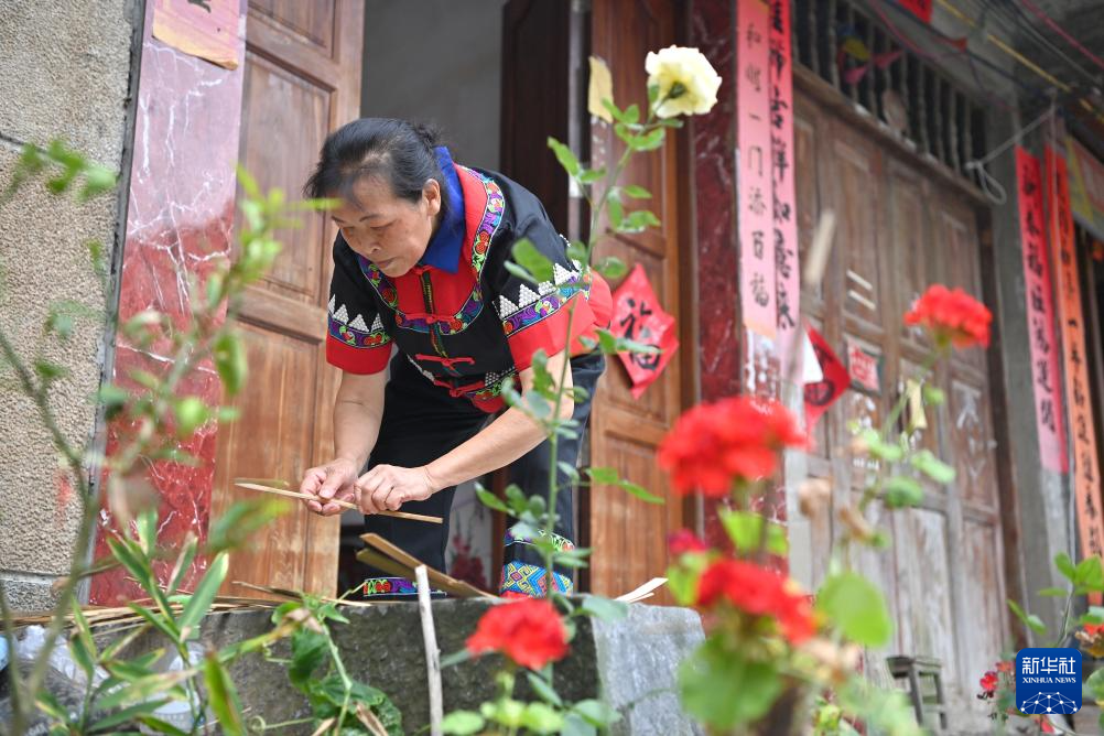 梁秀群在百色市田阳区巴别乡三坡村自家门前晾晒竹篾(8月21日摄)。